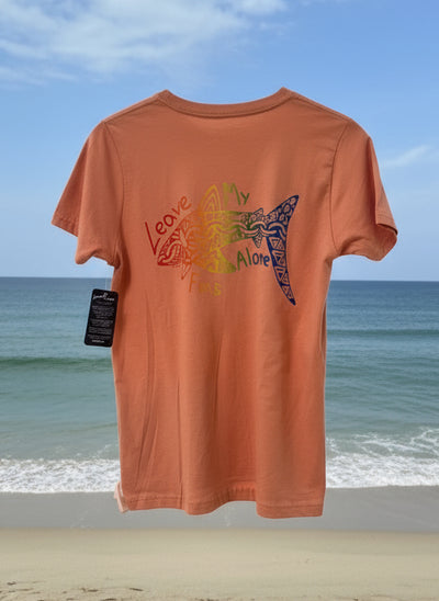 The "Leave My Fins Alone" Rainbow Shark design is printed on the backside of the youth tee shirt