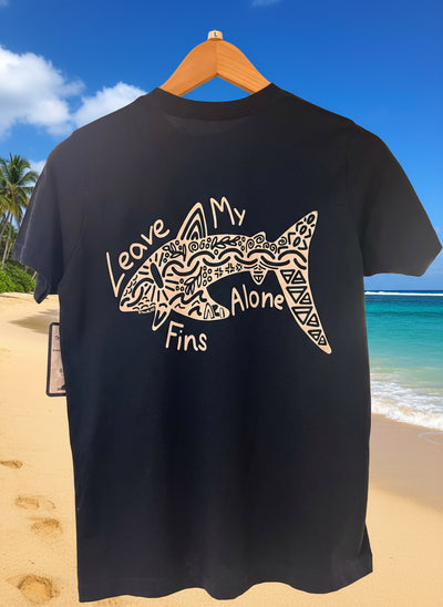 The "Leave My Fins Alone" White Shark design is printed on the backside of the youth tee shirt