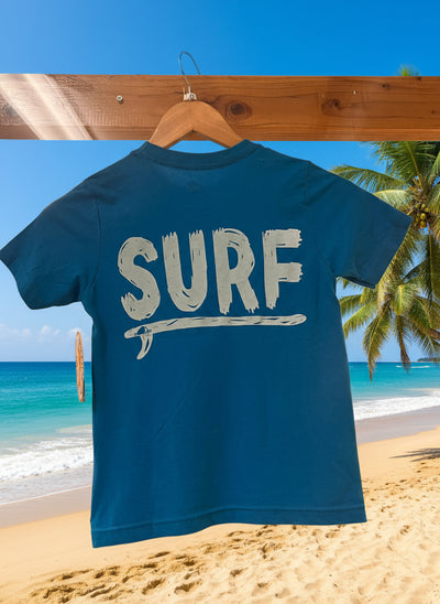 The "Surf Star" design is printed on the frontside of the youth tee shirt