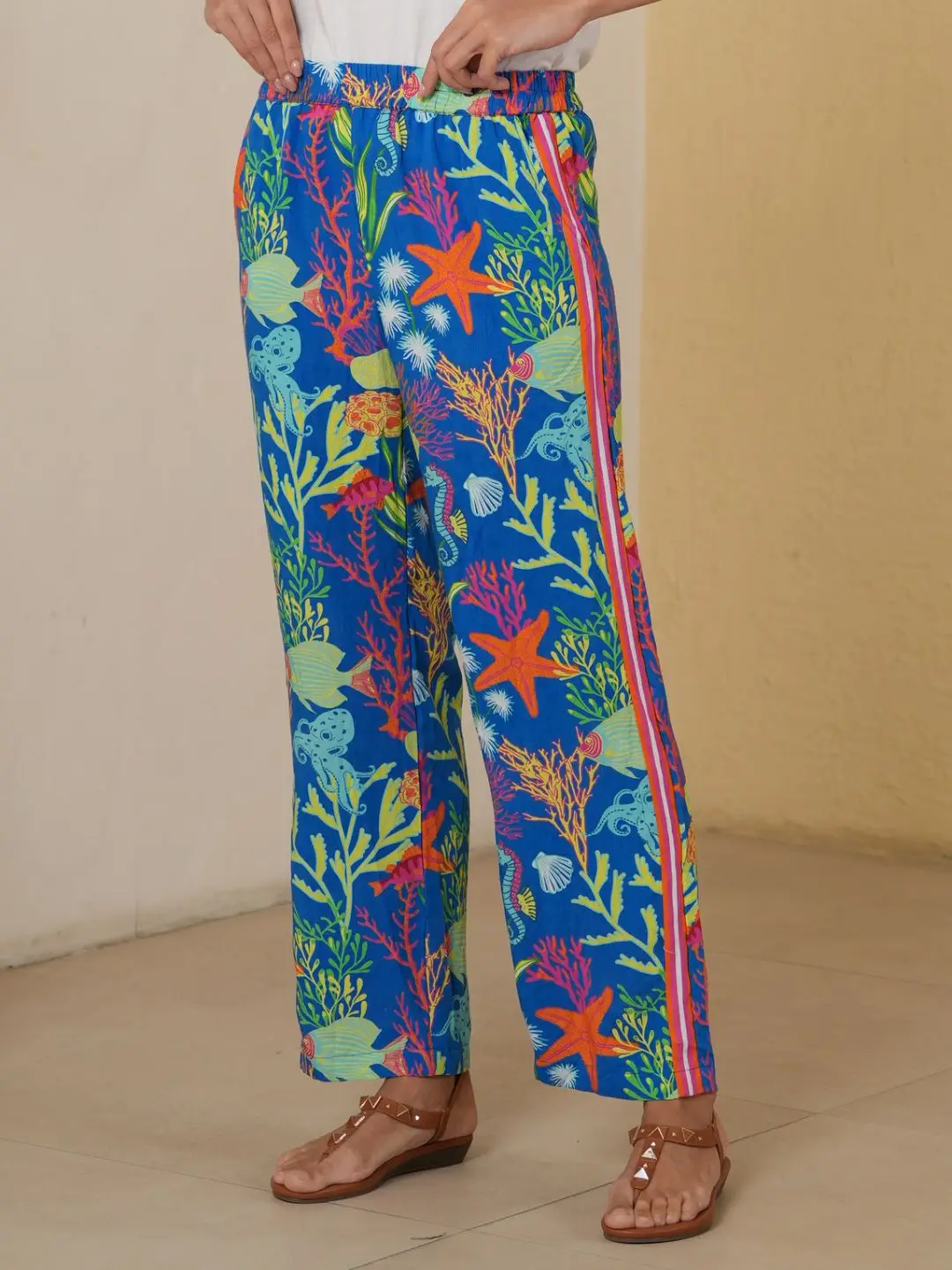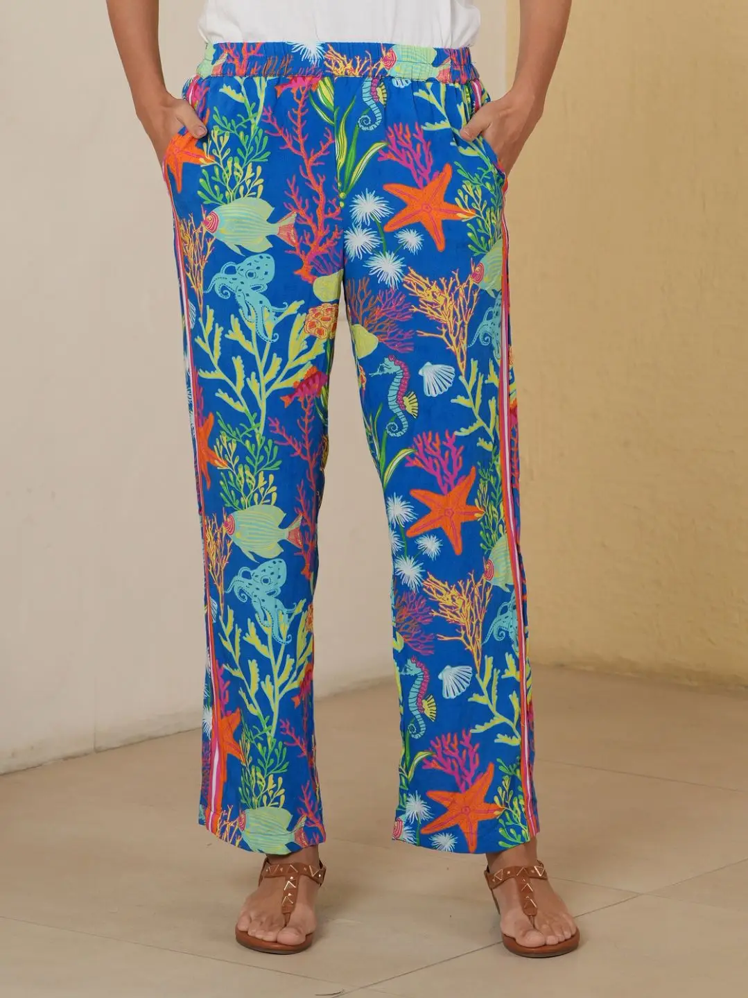 Bring an instant pop of color to your everyday wardrobe with the Coral Reef Printed Straight Pants. Designed with a vibrant ocean-inspired print featuring corals, starfish, fish, and marine details, these pants blend comfort with statement style. The easy elasticated waistband and relaxed straight-leg silhouette make them perfect for all-day wear, whether you’re strolling on vacation, lounging in style, or heading out for a casual day look.Â