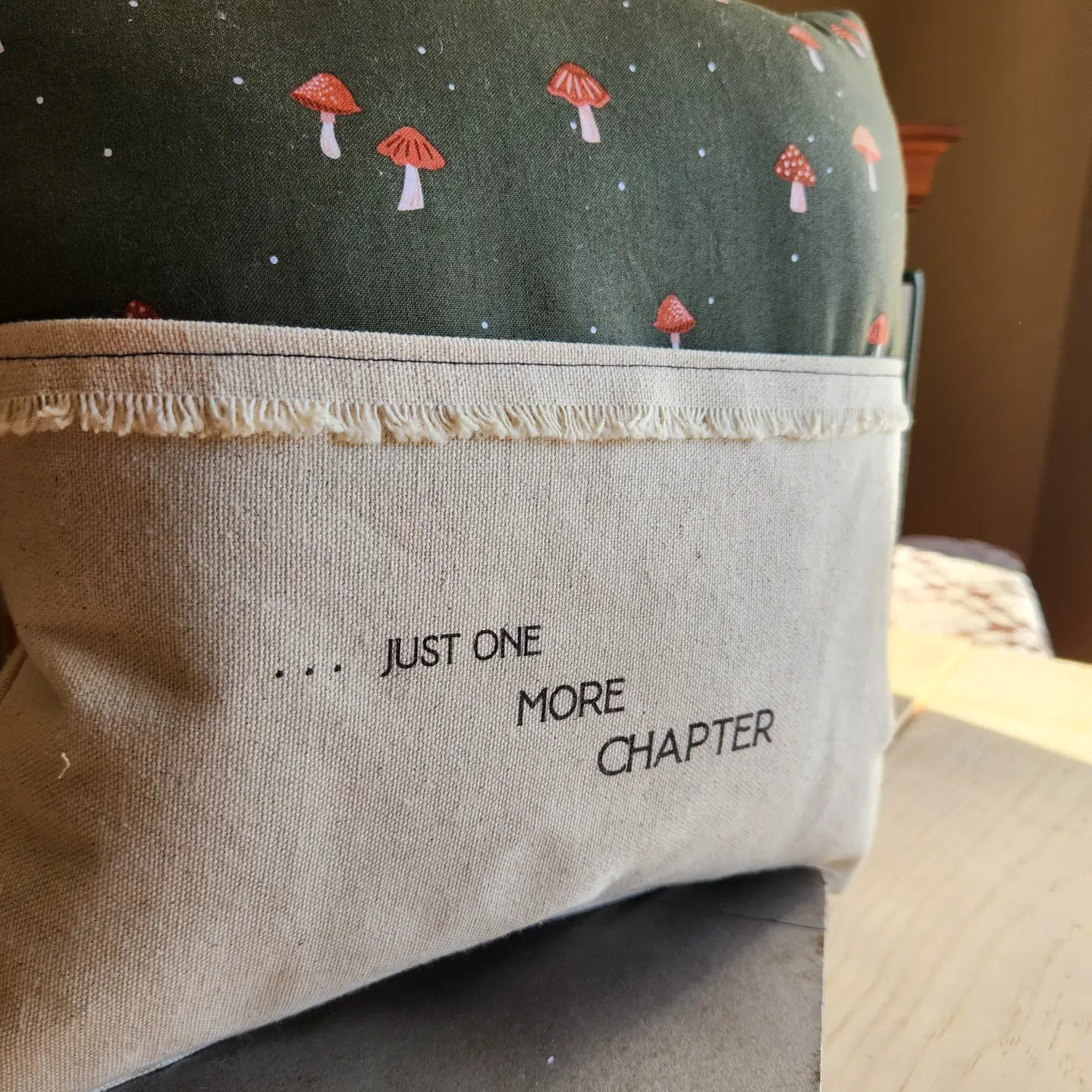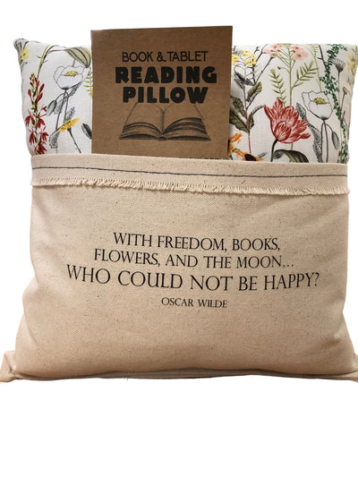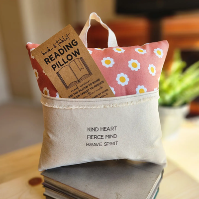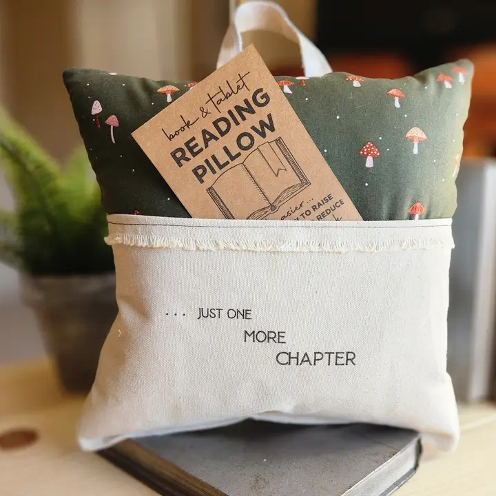 Regular price $39.00Not your typical throw... This unique pillow can be used when reading (or scrolling) on the lap while traveling, sitting, even reclining. The improved angle decreases the stress on the neck and shoulders. The 14x14 pillow is hand stuffed with poly-fil and has a pocket for a book, pair of glasses, e-reader, or tablet. The back, pocket, and handle are made with durable canvas, and a patterned fabric and reading related quote decorate the front.