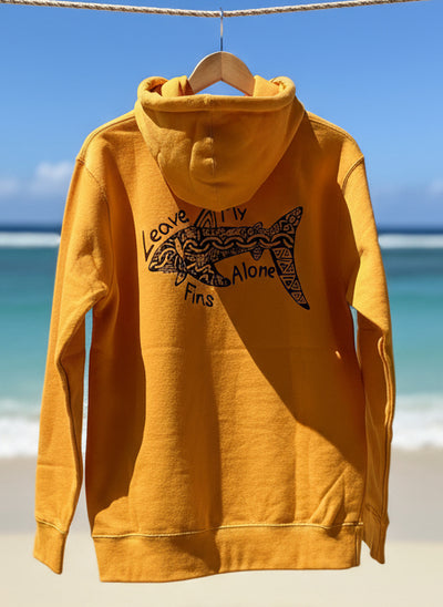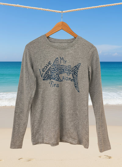 The "Leave My Fins Alone" Ocean Fade Shark design is on the front side of the long sleeve shirt
