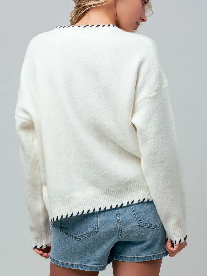 Embrace seaside charm with this cozy knit pullover featuring a bold lighthouse graphic patch. The relaxed, oversized fit is complemented by unique whipstitch detailing along the edges, making it a comfortable and stylish statement piece for casual wear.