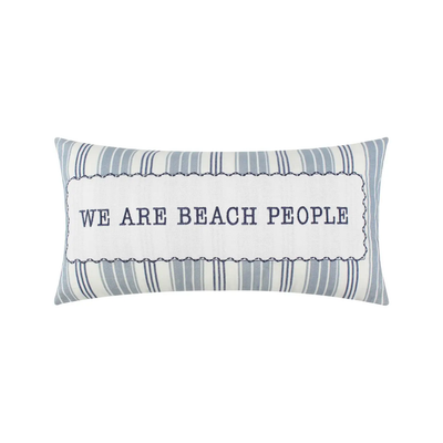 This pillow is sized at 12x24in., features an appliqued and embroidered pillow with the words WE ARE BEACH PEOPLE on a striped chambray blue and navy ground.